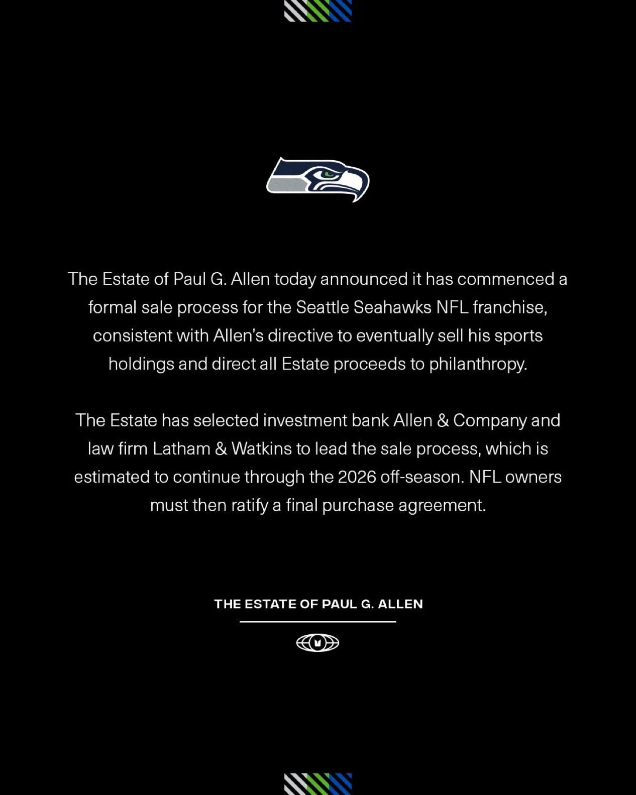 On Wednesday, the Estate of Paul G. Allen announced it has commenced a formal sale process for the reigning Super Bowl champions, fulfilling Allen’s long-expressed directive that his sports holdings eventually be sold and all proceeds directed to philanthropy.